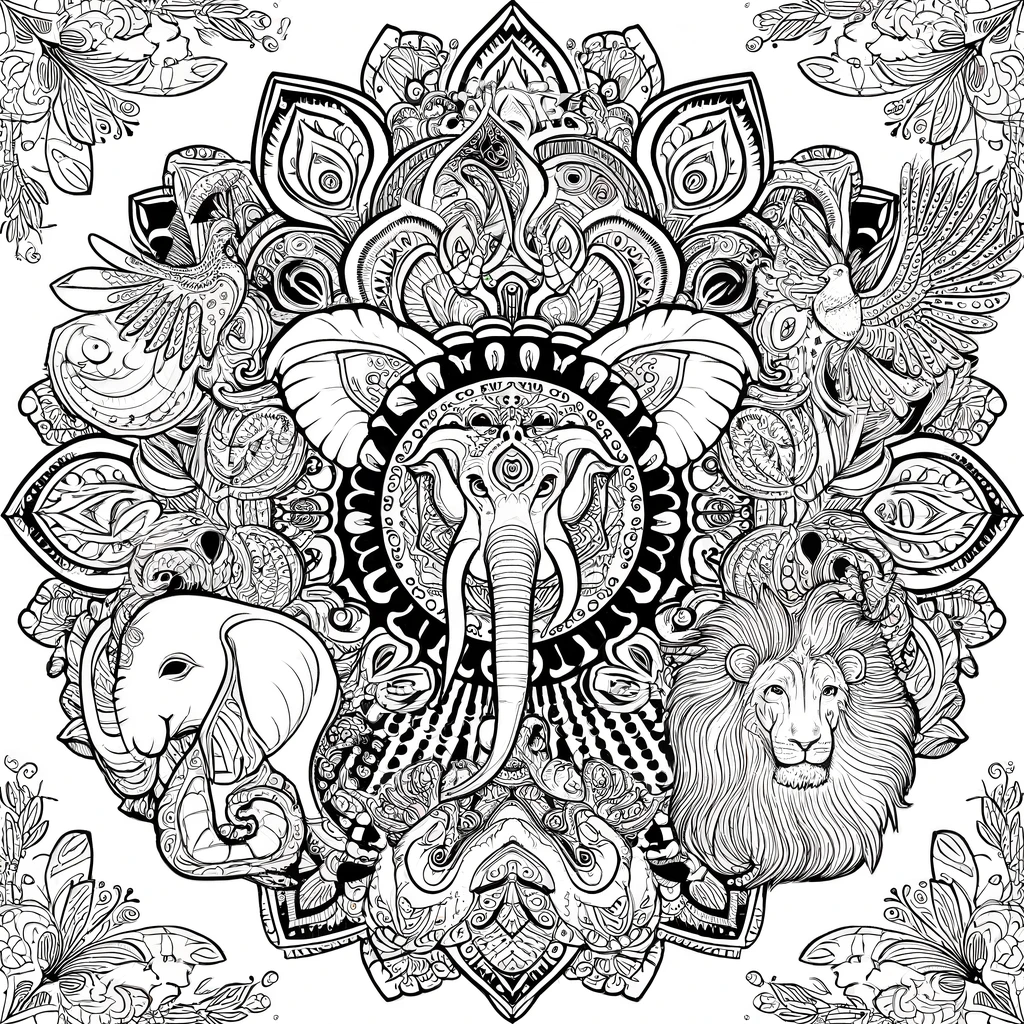 Mandala-Malvorlage mit komplexen Tiermotiven wie Elefant, Pfau und Löwe innerhalb eines Mandalamusters. Perfekt für ein meditatives Malerlebnis.