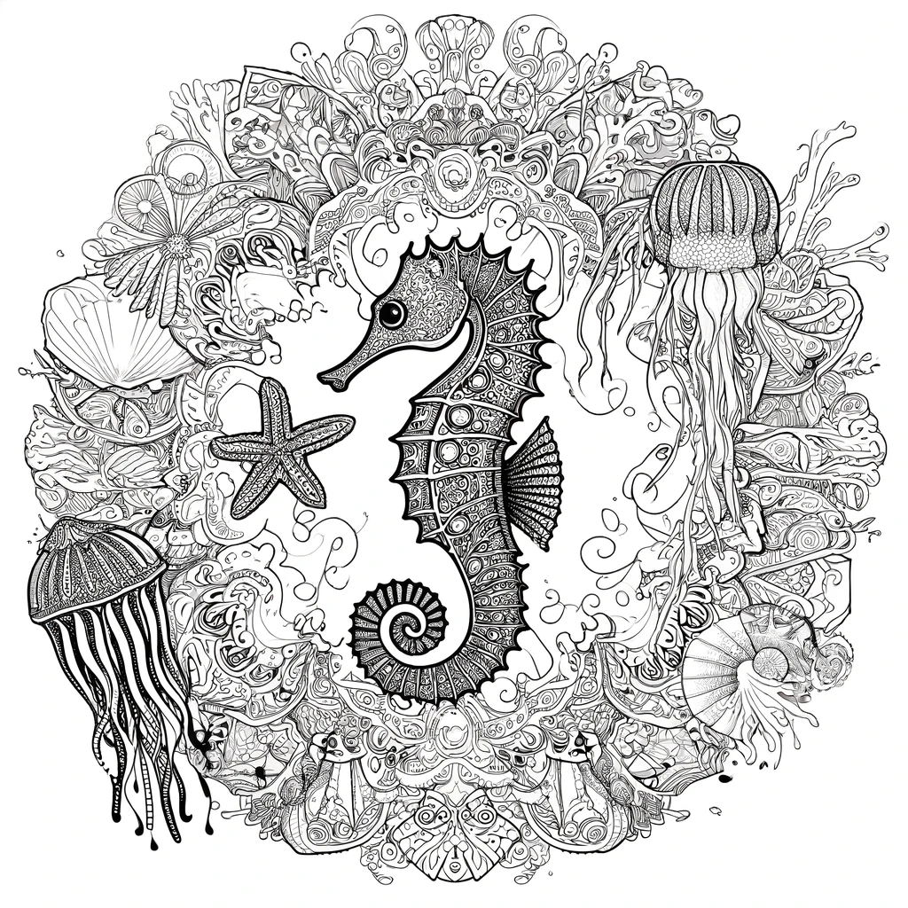 Mandala-Malvorlage mit komplexen Meereskreaturen wie Seepferdchen, Qualle und Seestern innerhalb eines Mandalamusters.