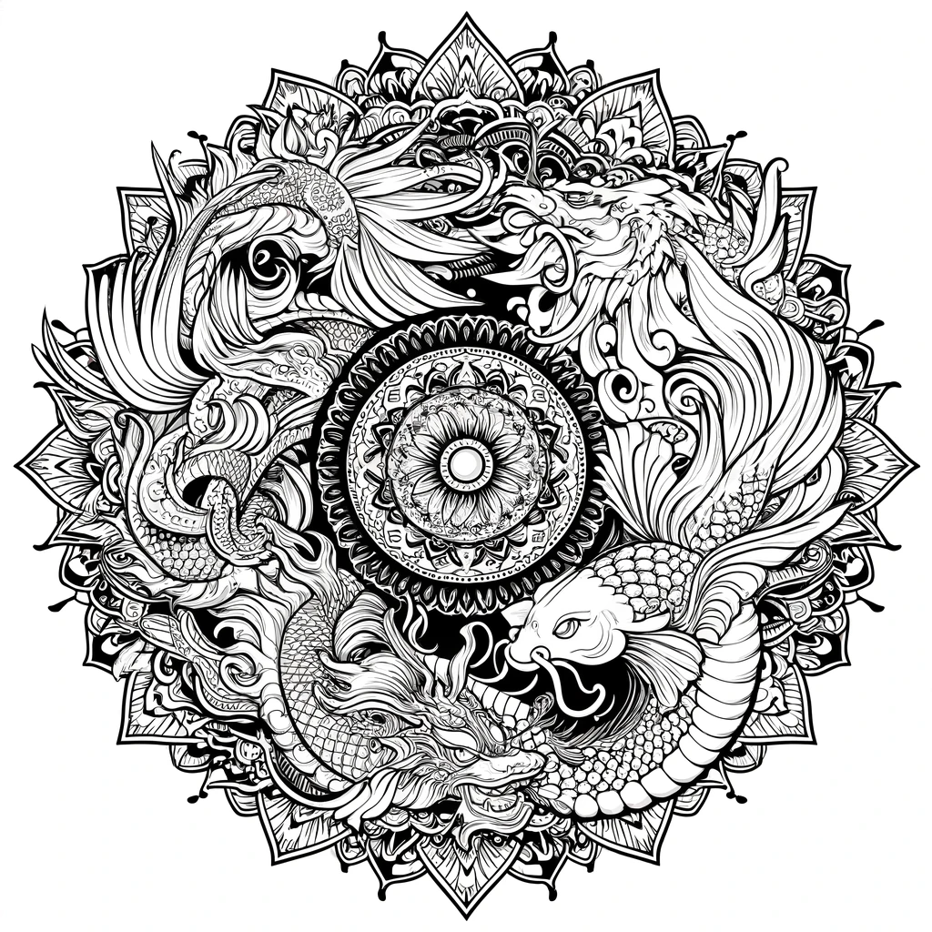 Mandala-Malvorlage mit mythischen Kreaturen wie Drache, Koi-Fisch und Phönix in einem komplexen Mandalamuster.