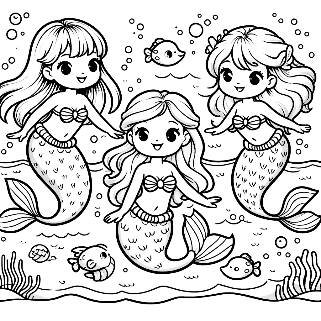 Malbuchseite mit einer Gruppe von drei Meerjungfrauen, die im Ozean spielen. Genieße es, diese Unterwasser-Szene zum Leben zu erwecken!