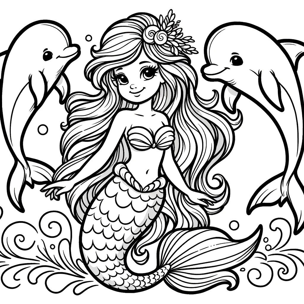 Malbuchseite mit einer Meerjungfrau, die zwei freundliche Delfine begleitet. Diese verspielte Szene eignet sich perfekt für eine unterhaltsame Ausmalerfahrung!