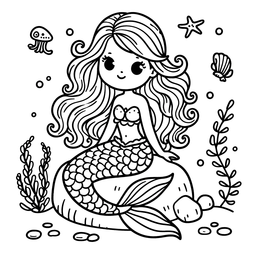Malbuchseite mit einer Meerjungfrau, entworfen um kreative Ausmalmomente zu inspirieren. Erwecke diese Unterwasser-Szene mit deinen Farben zum Leben!