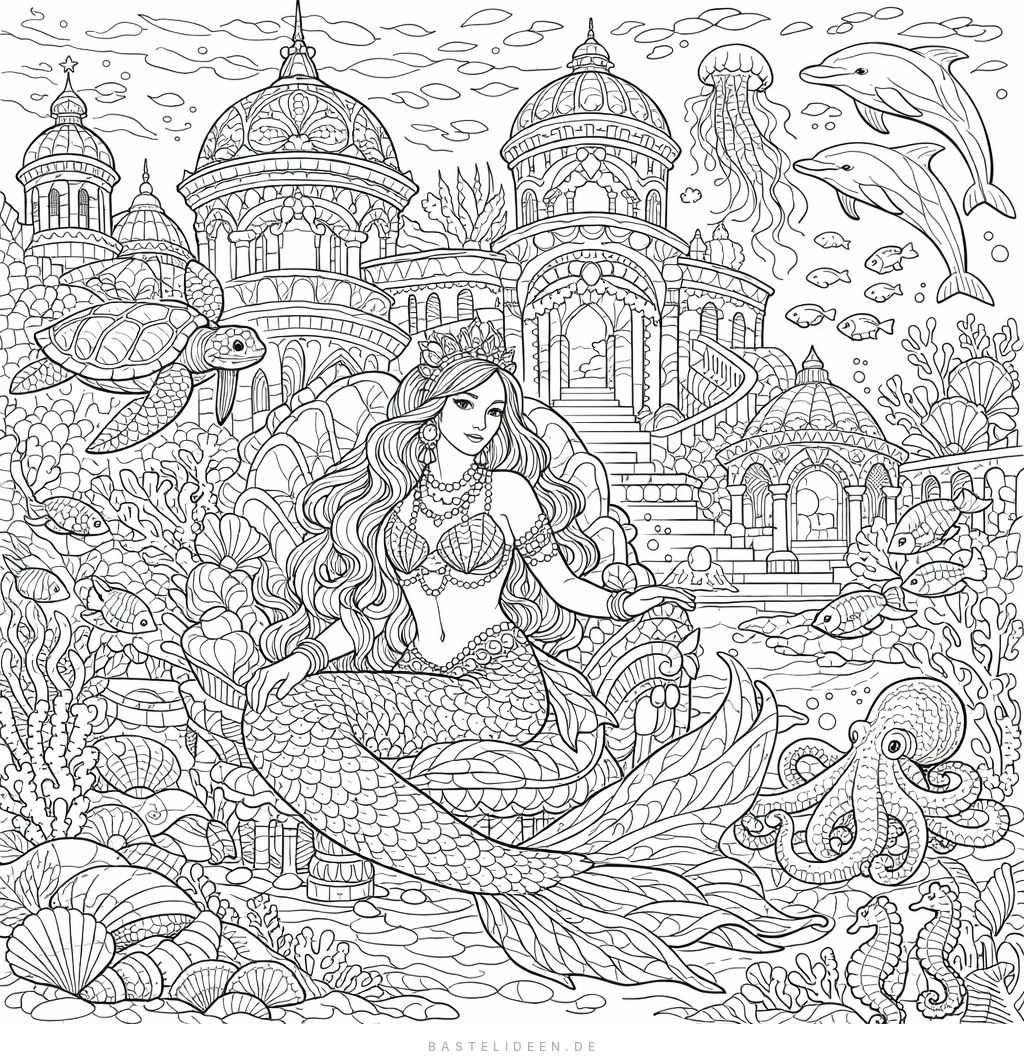 Eine Meerjungfrau in einem prächtigen Unterwasserpalast mit vielen Details zum Ausmalen.