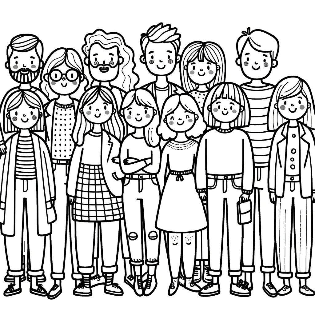 Dieses Bild zeigt eine bezaubernde und vielfaeltige Gruppe von lächelnden Menschen, die alle fröhlich zusammenstehen. Die Charaktere sind in einem einfachen, aber entzückenden Schwarz-Weiss-Stil dargestellt, perfekt zum Ausmalen.