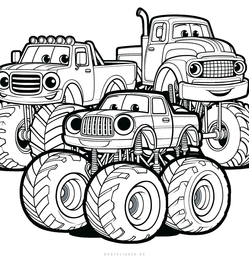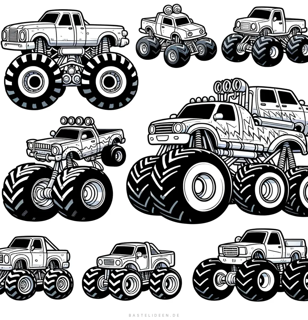 Entfessel deine Kreativität mit dieser Ausmalvorlage von verschiedenen Monstertrucks, jeder mit seinem eigenen Charakter, ausgestattet mit übergroßen Reifen und einer beeindruckenden Erscheinung.