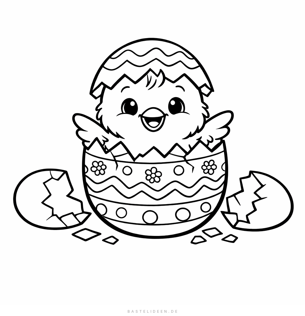 Ein süßes Küken schlüpft fröhlich aus einem wunderschön verzierten Osterei. Mit ausgebreiteten Flügelchen und Eierschalen drum herum – ein zauberhaftes Ostermotiv für Kinder ab 6 Jahren.