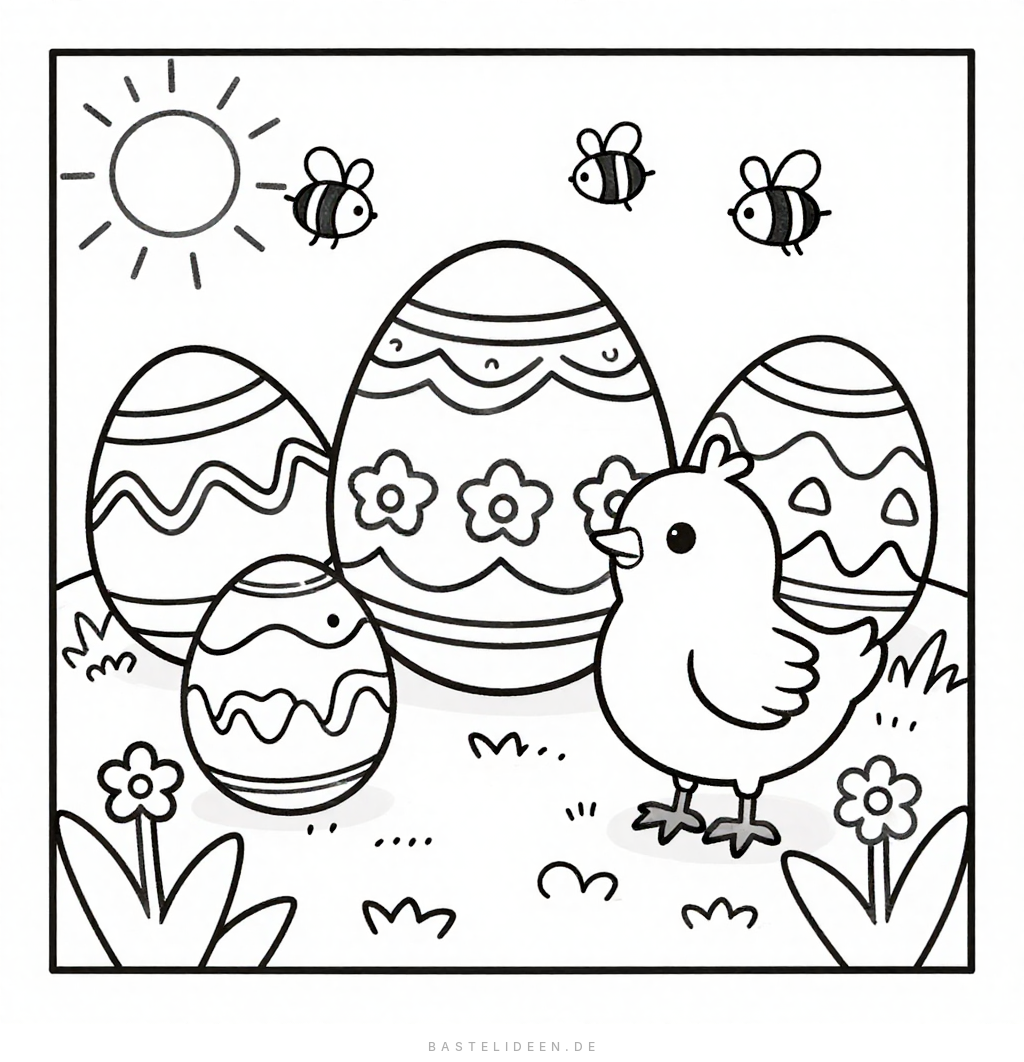 Dieses bezaubernde Ausmalbild vereint Frühlings- und Osterstimmung mit liebevollen Illustrationen von bunt verzierten Ostereiern, fröhlichen Blumen, einem niedlichen Küken auf einem Ei und summenden Bienen unter einer lächelnden Sonne.