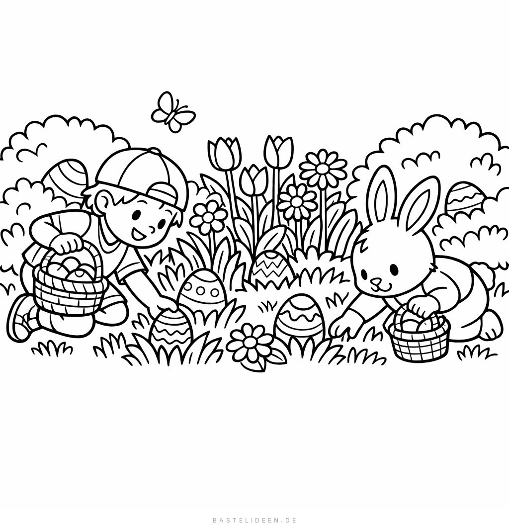 Eine fröhliche Ostereiersuche im Frühlingsgarten mit einem Kind und einem Hasen – viele Details zum Ausmalen für Kinder ab 6 Jahren.