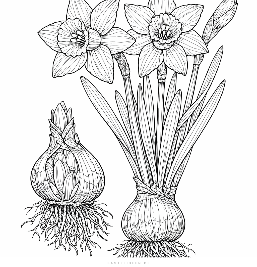 Eine wissenschaftlich anmutende botanische Illustration von Osterglocken (Narzissen). Die detaillierte Darstellung zeigt Blüten, Stängel, Blätter, Zwiebeln und das feine Wurzelsystem – perfekt für naturbegeisterte Ausmalkünstler.