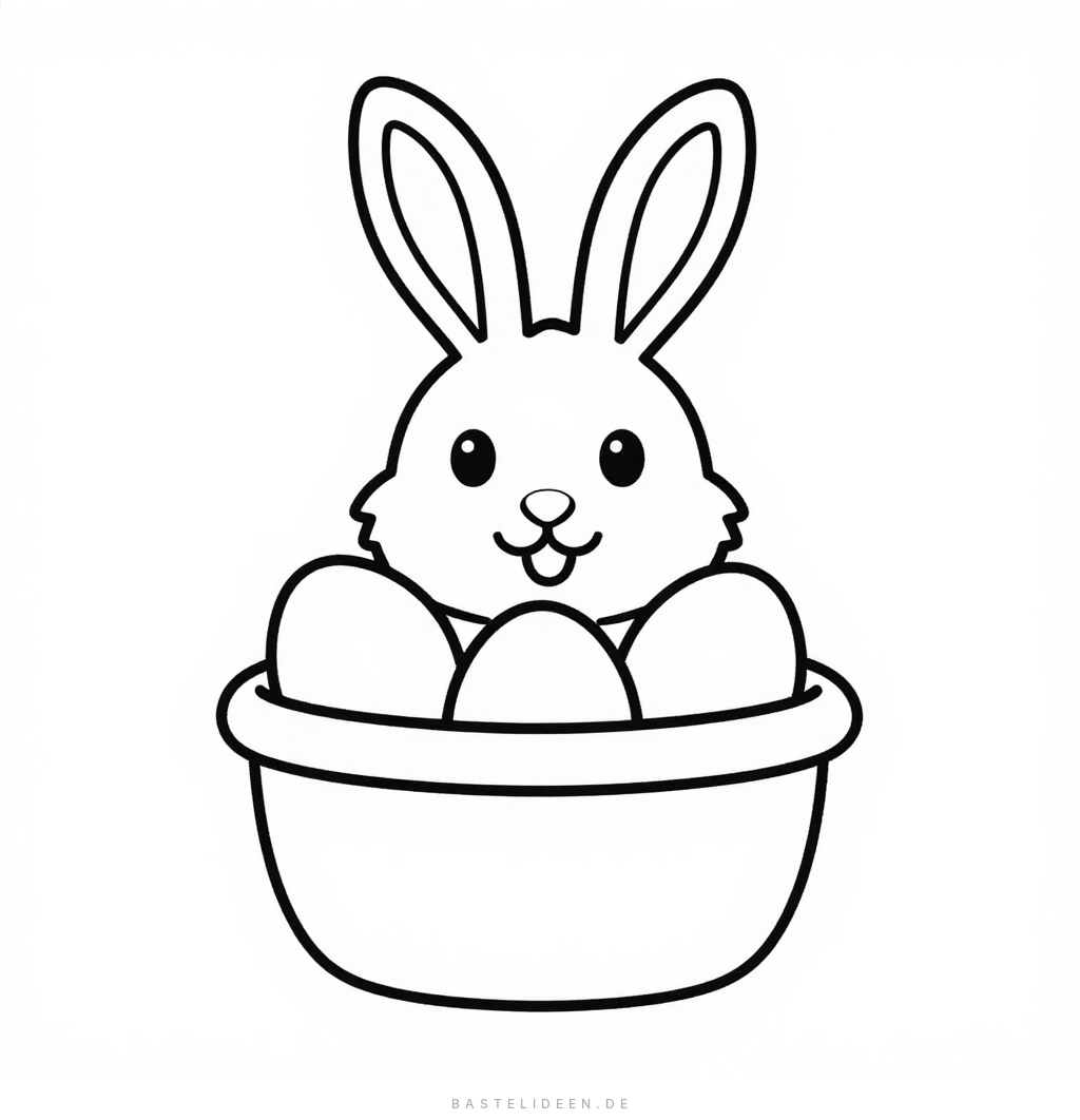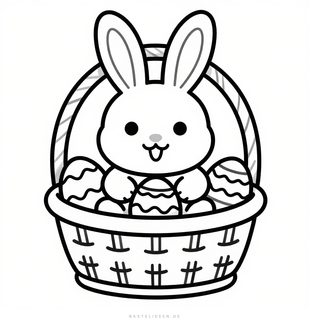Ein fröhlicher Osterhase wartet im Körbchen zwischen bunten Ostereiern – perfekt für kleine Künstler ab 3 Jahren, die sich auf Ostern freuen.