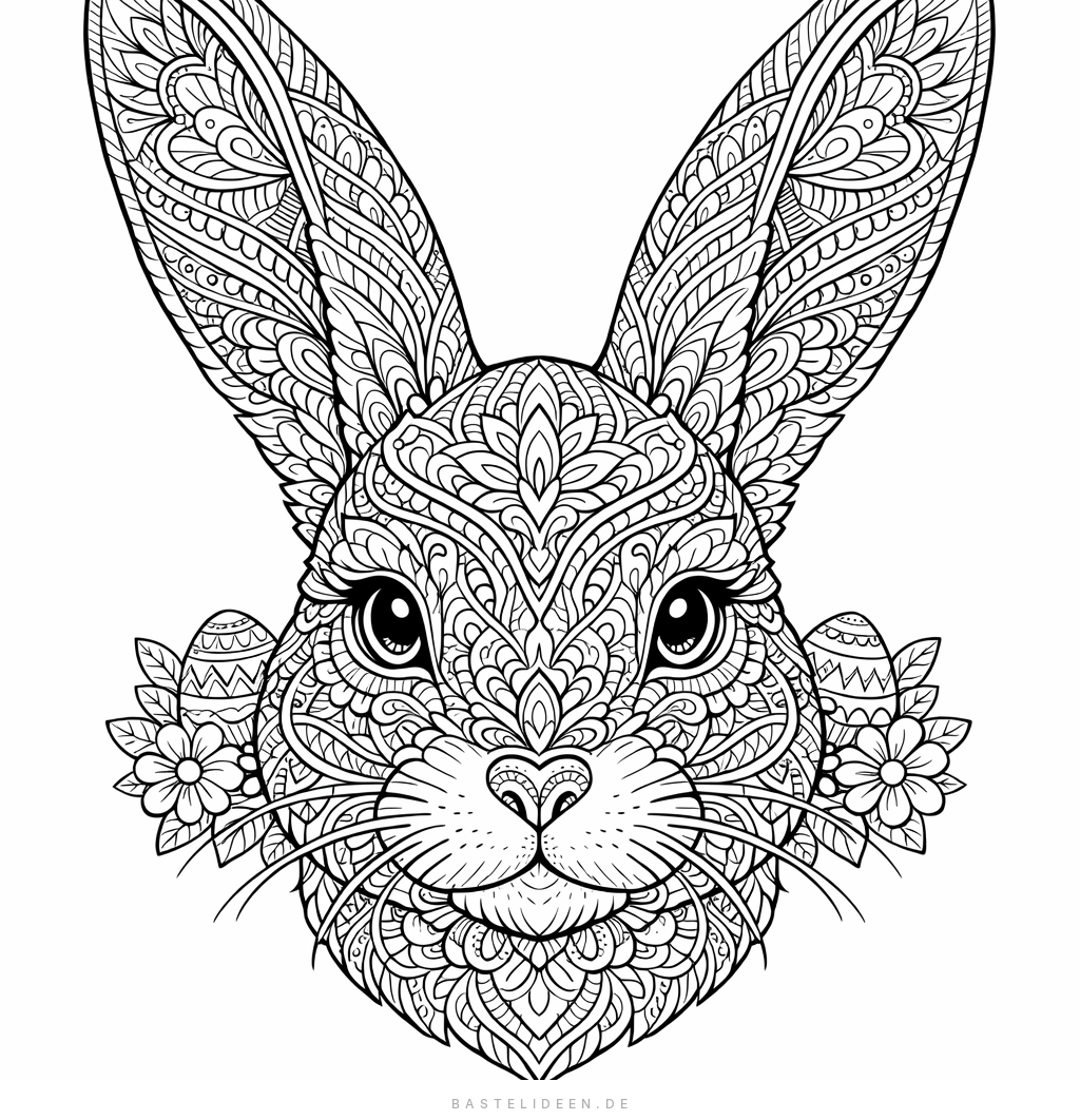 Dieses kunstvolle Hasenportrait zeigt einen Osterhasen mit wunderschönen Zentangle-Mustern im Fell. Filigrane Ornamente, kleine Blumen und detaillierte Linien machen diese Malvorlage perfekt für entspannende Ausmalstunden.