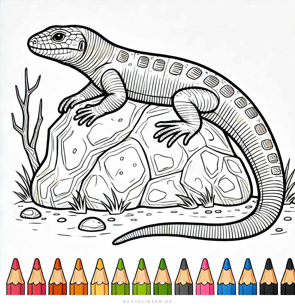 Dieses detaillierte Ausmalbild zeigt eine Eidechse, die sich auf einem Felsen sonnt, umgeben von einer natürlichen Umgebung mit Pflanzen und Steinen. Die kunstvollen Schuppen und die realistische Pose der Eidechse machen dieses Bild perfekt für Reptilienliebhaber und Naturfreunde.