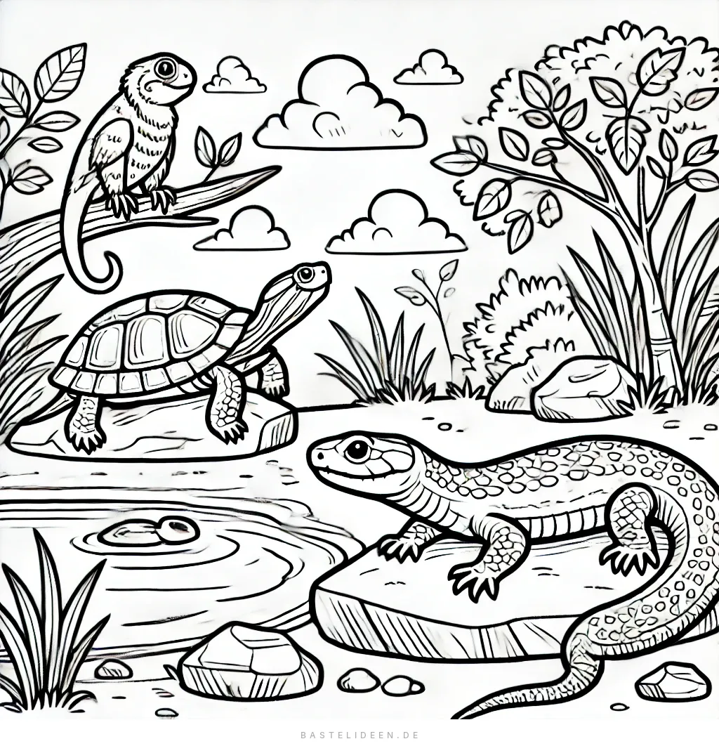 Dieses fesselnde Ausmalbild zeigt eine Vielzahl von Reptilien in ihrem natürlichen Lebensraum. Du siehst eine Schildkröte, die auf einem Felsen sonnt, eine Eidechse, die am Teich liegt, und ein Chamäleon, das auf einem Ast sitzt.