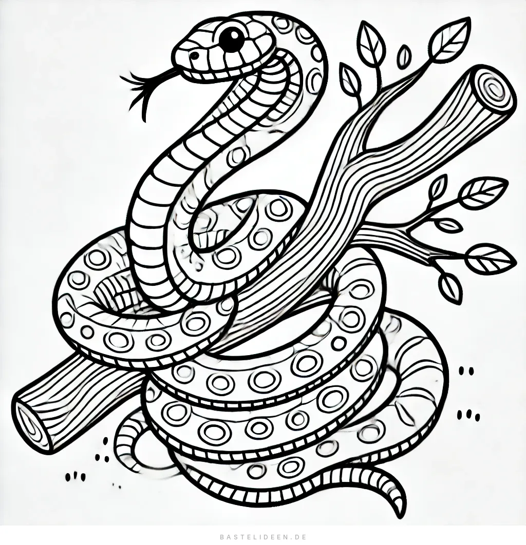 Dieses faszinierende Ausmalbild zeigt eine kunstvoll gemusterte Schlange, die sich um einen Ast windet. Mit ihren detaillierten Schuppen und ihrem ausdrucksstarken Gesicht lädt die Schlange dich ein, sie mit deinen leuchtenden Farben zum Leben zu erwecken.