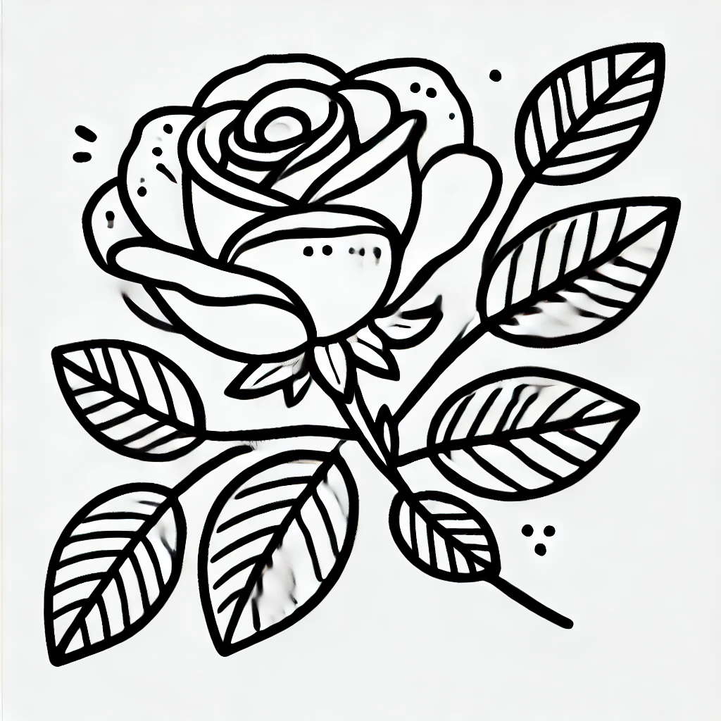 Dieses bezaubernde Ausmalbild zeigt eine einzelne blühende Rose, umgeben von einigen Blättern. Ideal für alle, die minimalistische Designs lieben.