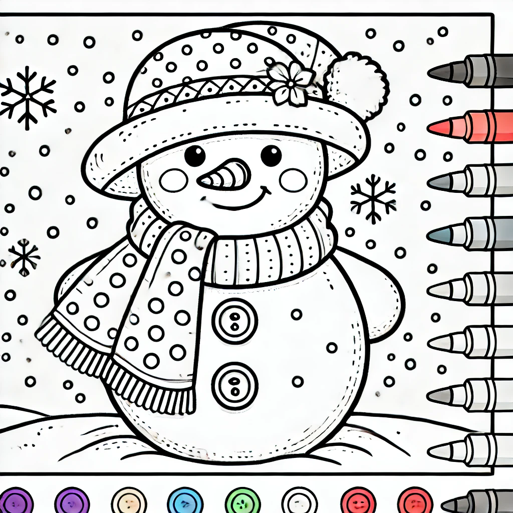 Dieses entzückende Ausmalbild zeigt einen niedlichen Schneemann, der eine gemütliche Mütze und einen Schal trägt und von fallenden Schneeflocken umgeben ist.