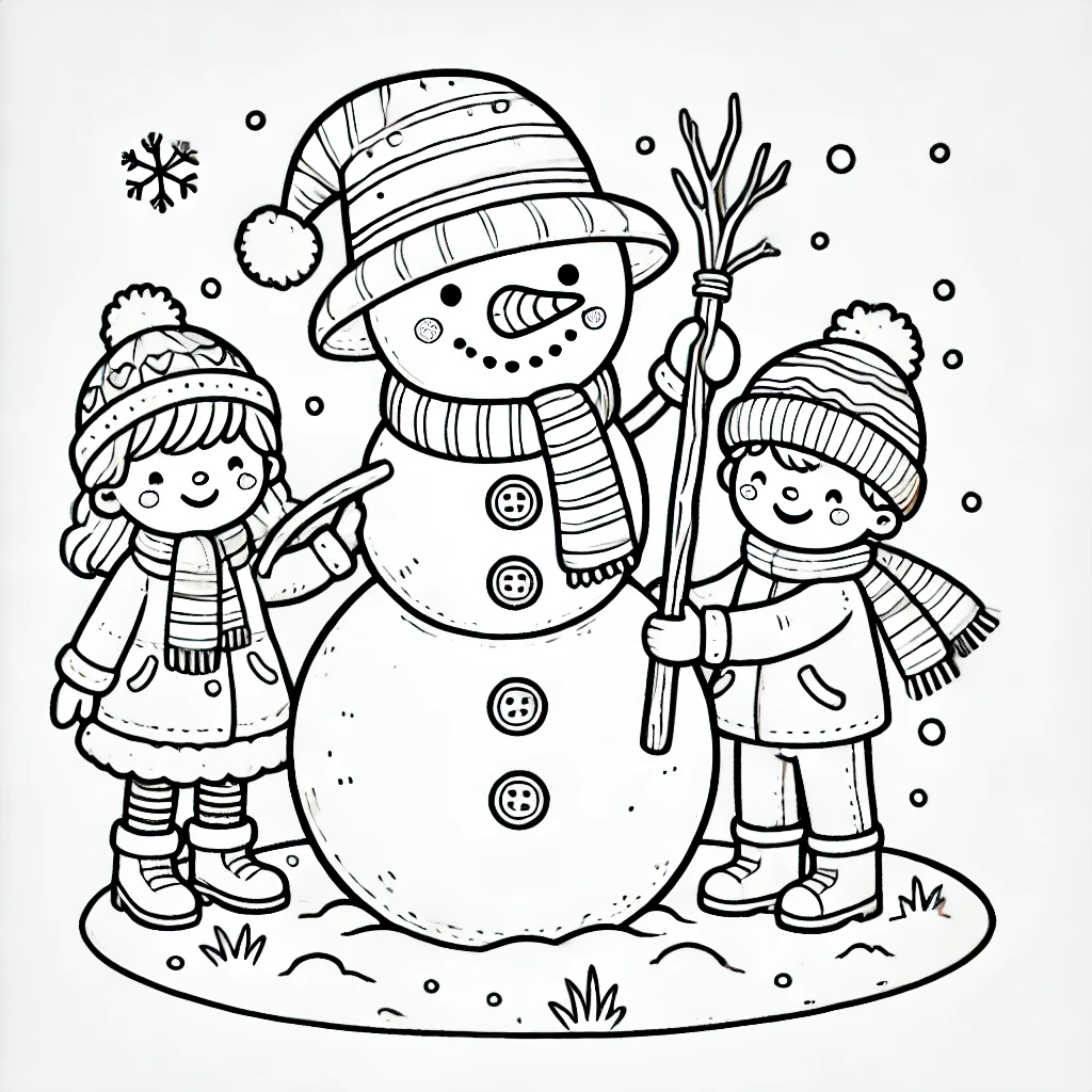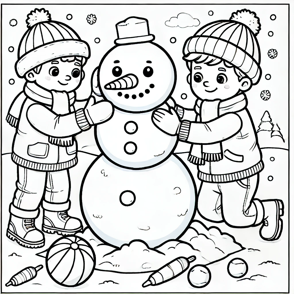 Dieses entzückende Ausmalbild zeigt eine charmante Szene von zwei Kindern, die fröhlich einen Schneemann bauen. Der Schneemann steht groß und stolz mit gemütlicher Mütze.