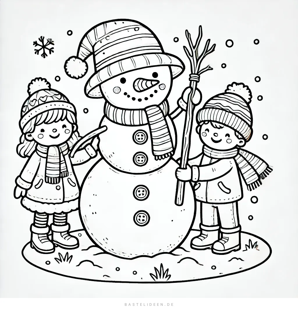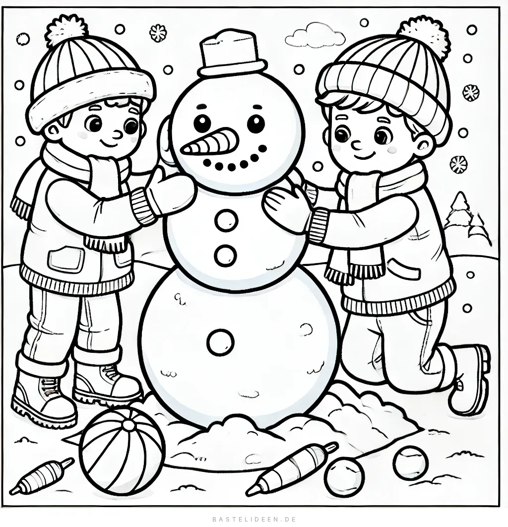 Dieses entzückende Ausmalbild zeigt eine charmante Szene von zwei Kindern, die fröhlich einen Schneemann bauen. Der Schneemann steht groß und stolz mit gemütlicher Mütze.
