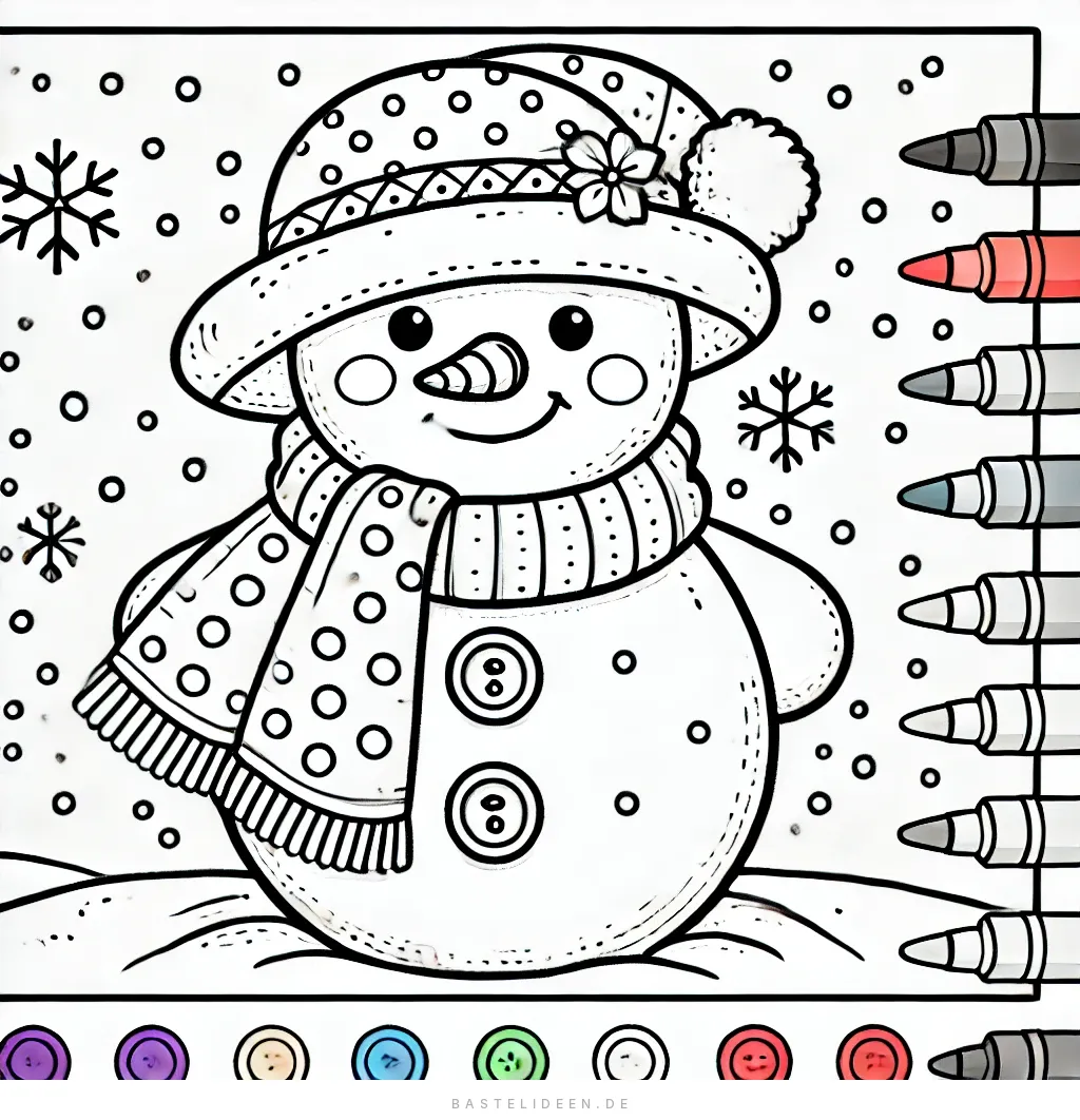 Dieses entzückende Ausmalbild zeigt einen niedlichen Schneemann, der eine gemütliche Mütze und einen Schal trägt und von fallenden Schneeflocken umgeben ist.