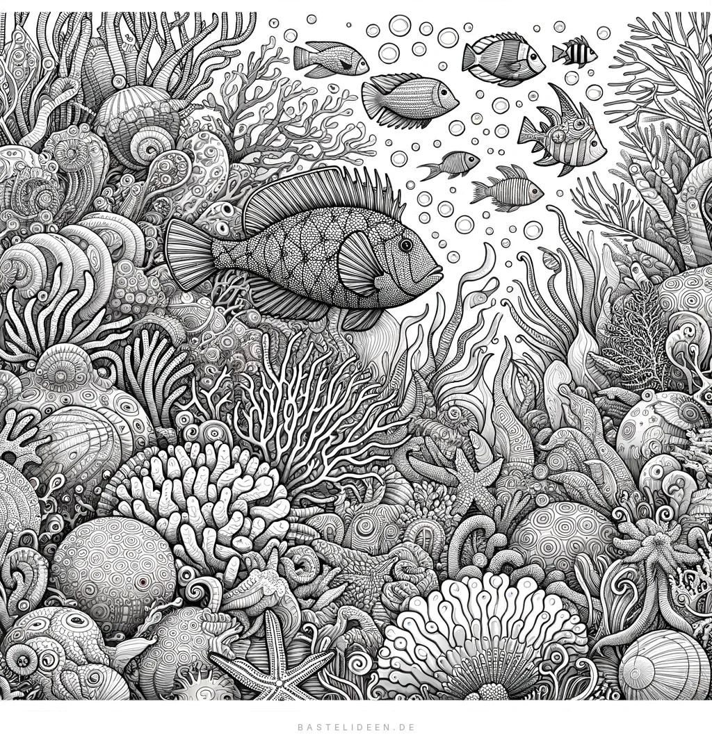 Tauche mit unserer komplexen Meeresleben-Ausmalvorlage in die Tiefen des Ozeans. Filigranen Korallenriffen und vielfältigen Fischen.
