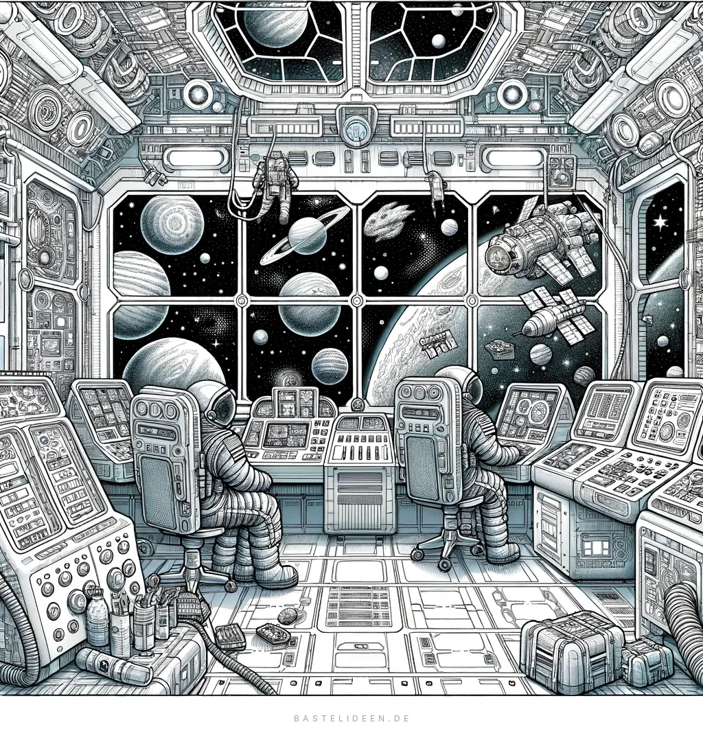 Starte deine eigene beeindruckende Ausmalfahrt mit unserer detailreichen Raumstation-Ausmalvorlage mit Kontrolltafeln und Astronauten.