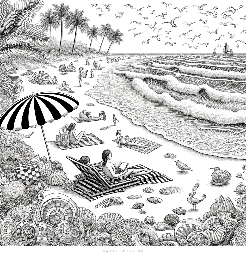 Dieses wunderschön detaillierte Ausmalbild fängt einen friedlichen Sommertag am Strand ein, mit Menschen, die auf Handtüchern und Liegen entspannen, Bücher lesen und die Wellen geniessen. Die Szene ist voller feinster Details, von den Muscheln und Strandsonnenschirmen bis zu den Vögeln.