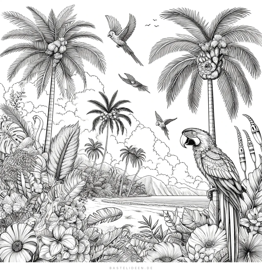 Dieses atemberaubende Ausmalbild zeigt ein üppiges tropisches Paradies, gefüllt mit lebhaften Palmen, exotischen Blumen und anmutigen Papageien im Flug. Die detaillierte Illustration fängt die Schönheit der Natur ein.