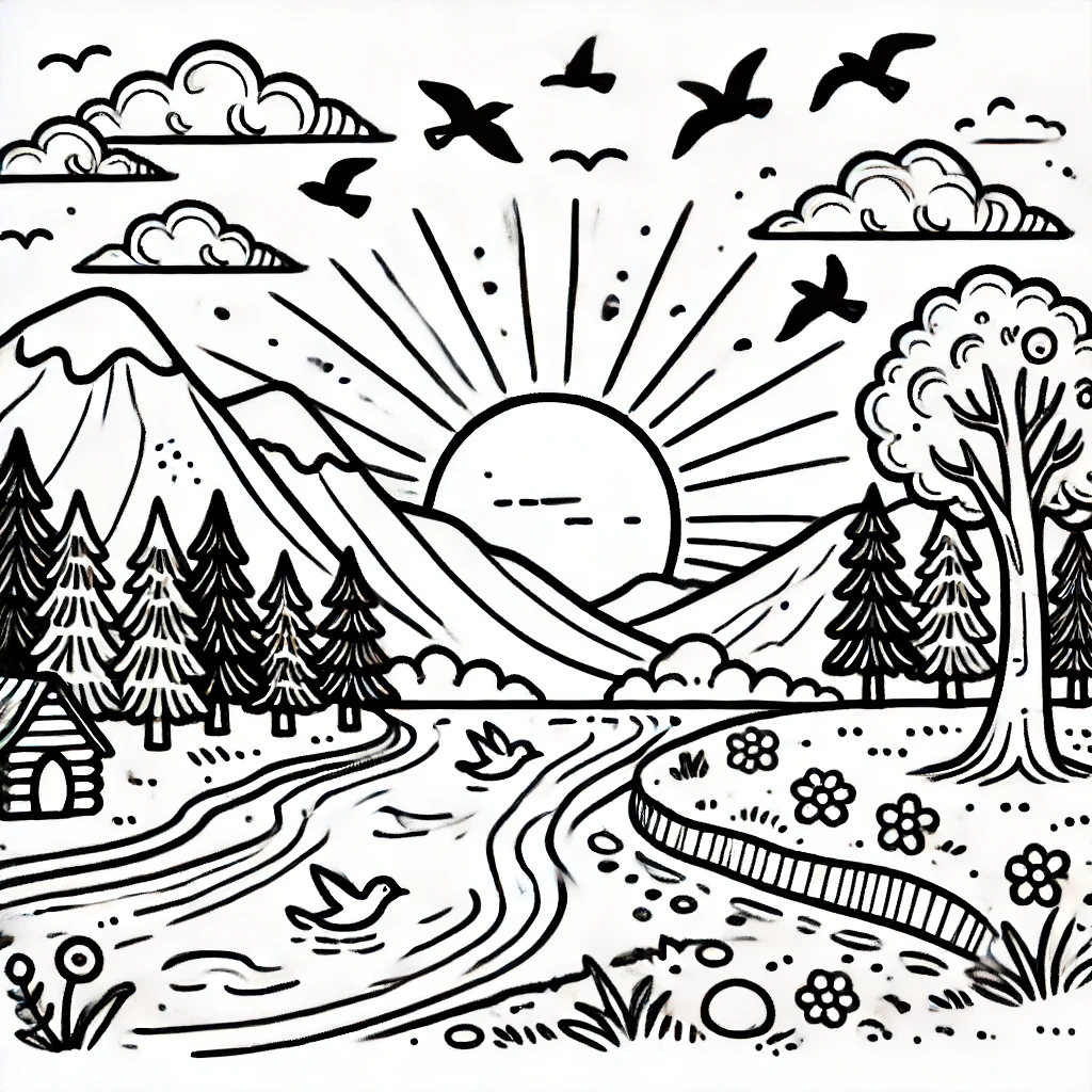 Dieses wunderschöne Ausmalbild zeigt eine friedliche Sonnenuntergangsszene über einer Berglandschaft, mit einem Fluss, der sich durch Kiefern schlaengelt, und einer gemütlichen Hütte am Wasser. Vögel fliegen über den Himmel.