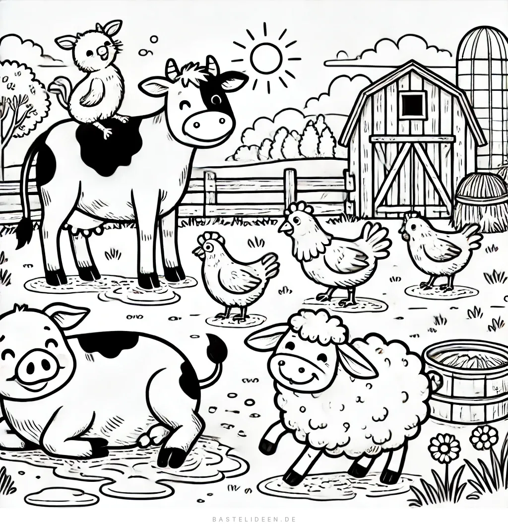 Dieses bezaubernde Ausmalbild zeigt eine fröhliche Szene mit glücklichen Bauernhoftieren, die einen sonnigen Tag auf dem Bauernhof genießen.