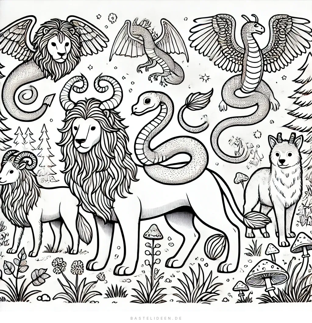 Dieses bezaubernde Ausmalbild zeigt eine Vielzahl magischer Fabelwesen, darunter einen majestätischen Löwen mit Widderhörnern, geflügelte Schlangen und andere fantastische Kreaturen.