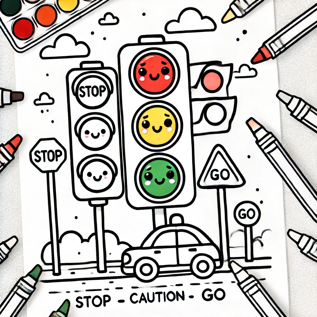 Dieses niedliche Ausmalbild zeigt eine fröhliche Ampel mit lachenden Gesichtern auf den roten, gelben und grünen Signalen. Begleitet von Stoppschildern und einem süßen Auto ist diese spielerische Szene perfekt, um Kindern auf unterhaltsame Weise etwas über Ampeln beizubringen.