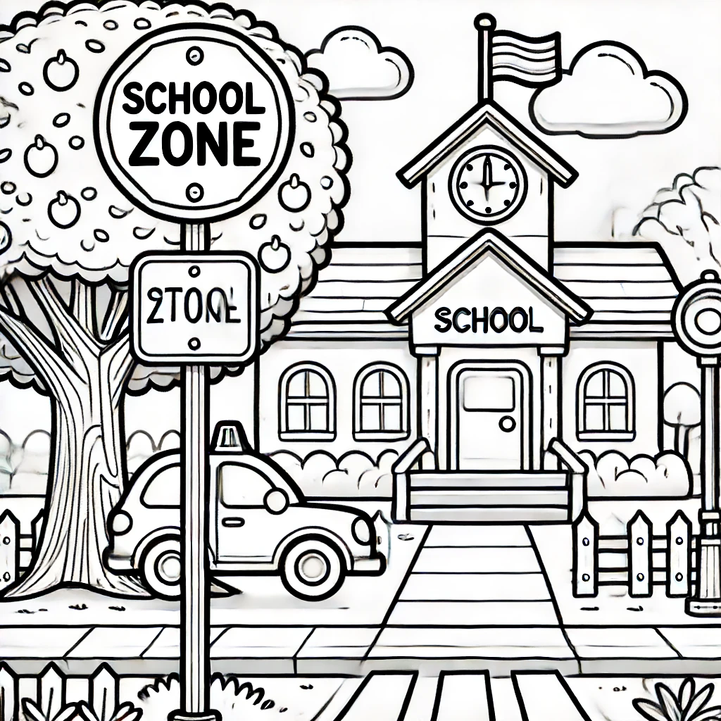 Dieses entzückende Ausmalbild zeigt eine lebhafte Schulzone, komplett mit einem Schulgebäude, einem Auto und auffälligen Schulzonen-Schildern. Die Illustration umfasst einen Apfelbaum, einen Uhrenturm an der Schule und eine im Wind wehende Flagge.