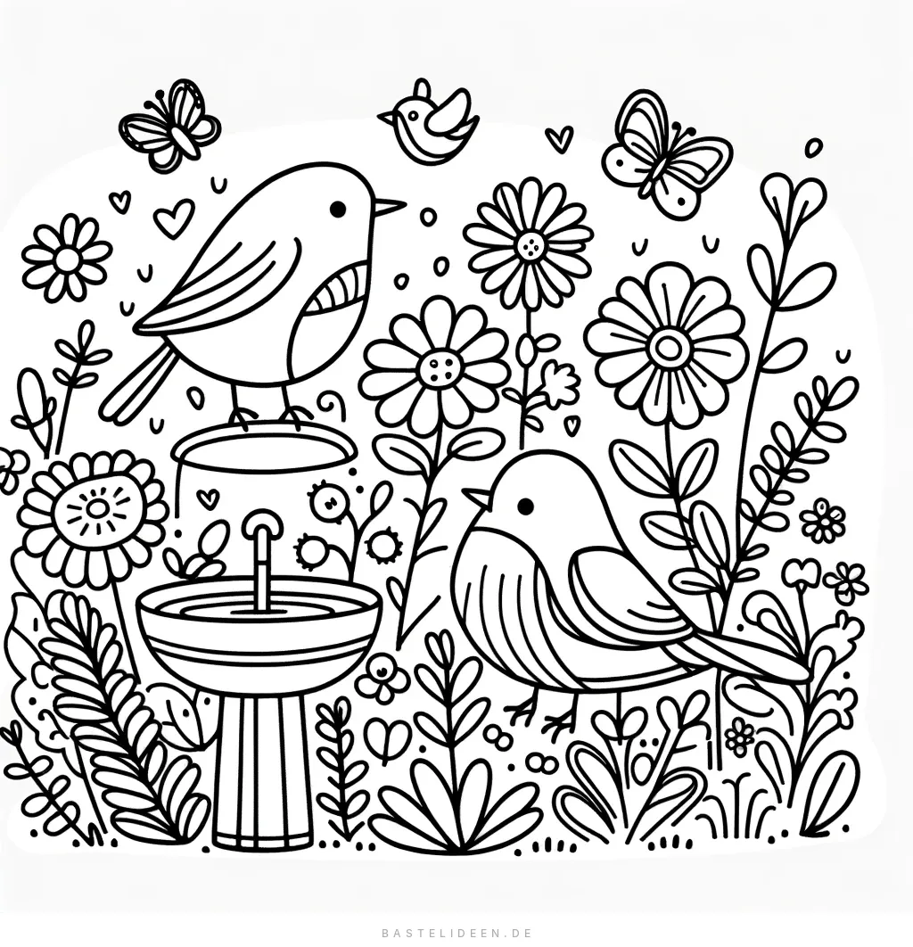 Dieses bezaubernde Ausmalbild zeigt eine lebendige Gartenszene mit zwei Vögeln, die ein Vogelbad geniessen, umgeben von blühenden Blumen und flatternden Schmetterlingen.