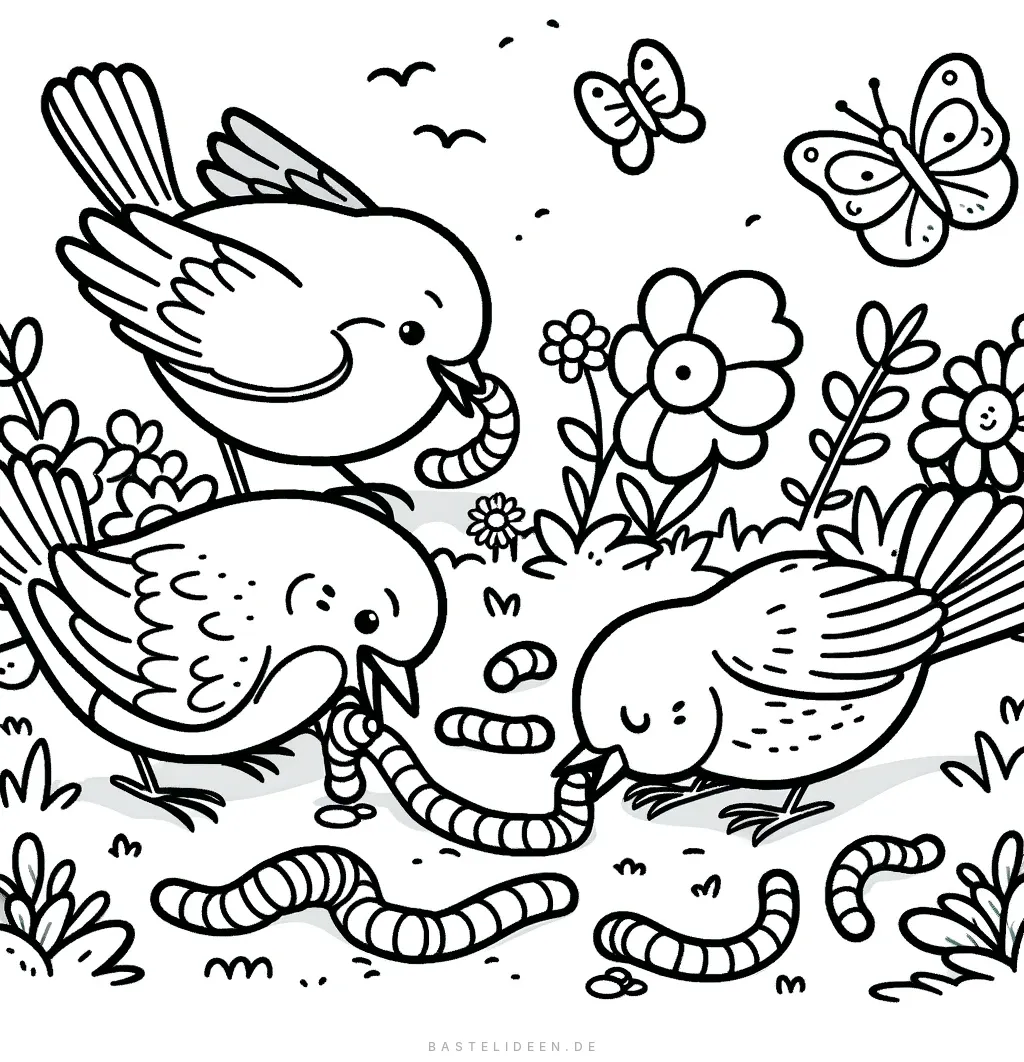 Diese niedliche Malvorlage zeigt drei Vögel im Garten, die gemeinsam nach Würmern suchen. Mit Schmetterlingen und Blumen im Hintergrund bietet dieses Bild ein fröhliches Malerlebnis.