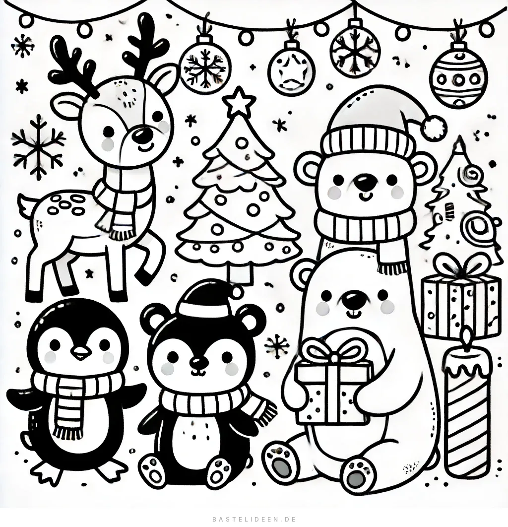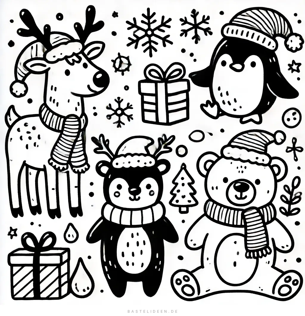 Das beigefügte Bild zeigt eine bezaubernde Szene voller niedlicher Weihnachtstiere, perfekt für weihnachtlichen Malspaß. Die Illustration umfasst ein fröhliches Rentier, einen gemütlichen Eisbären mit einem Geschenk, einen verspielten Pinguin und einen niedlichen Bären.