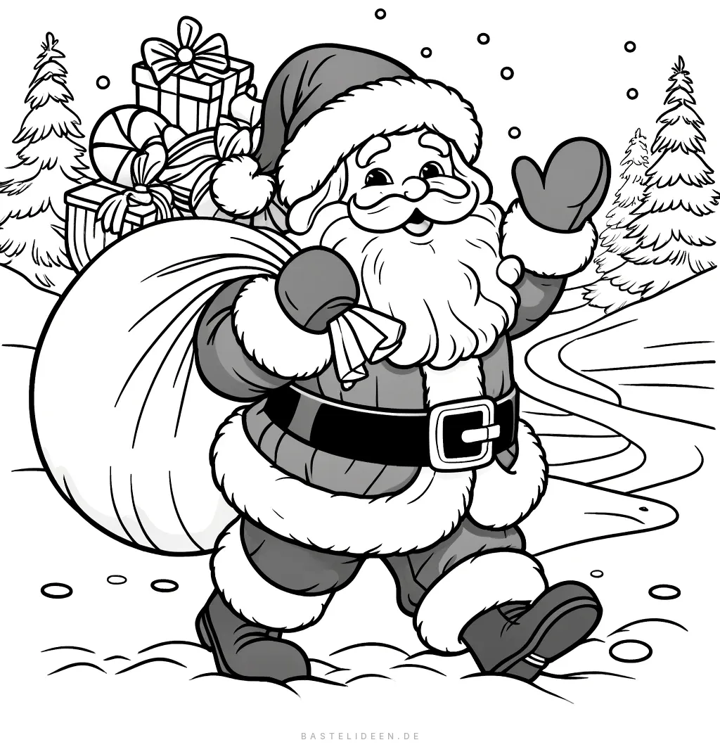 Dieses festliche Ausmalbild zeigt einen fröhlichen Weihnachtsmann, der durch eine verschneite Winterlandschaft wandert. Mit seinem prall gefüllten Geschenksack und einem freundlichen Winken verbreitet er Weihnachtsfreude.