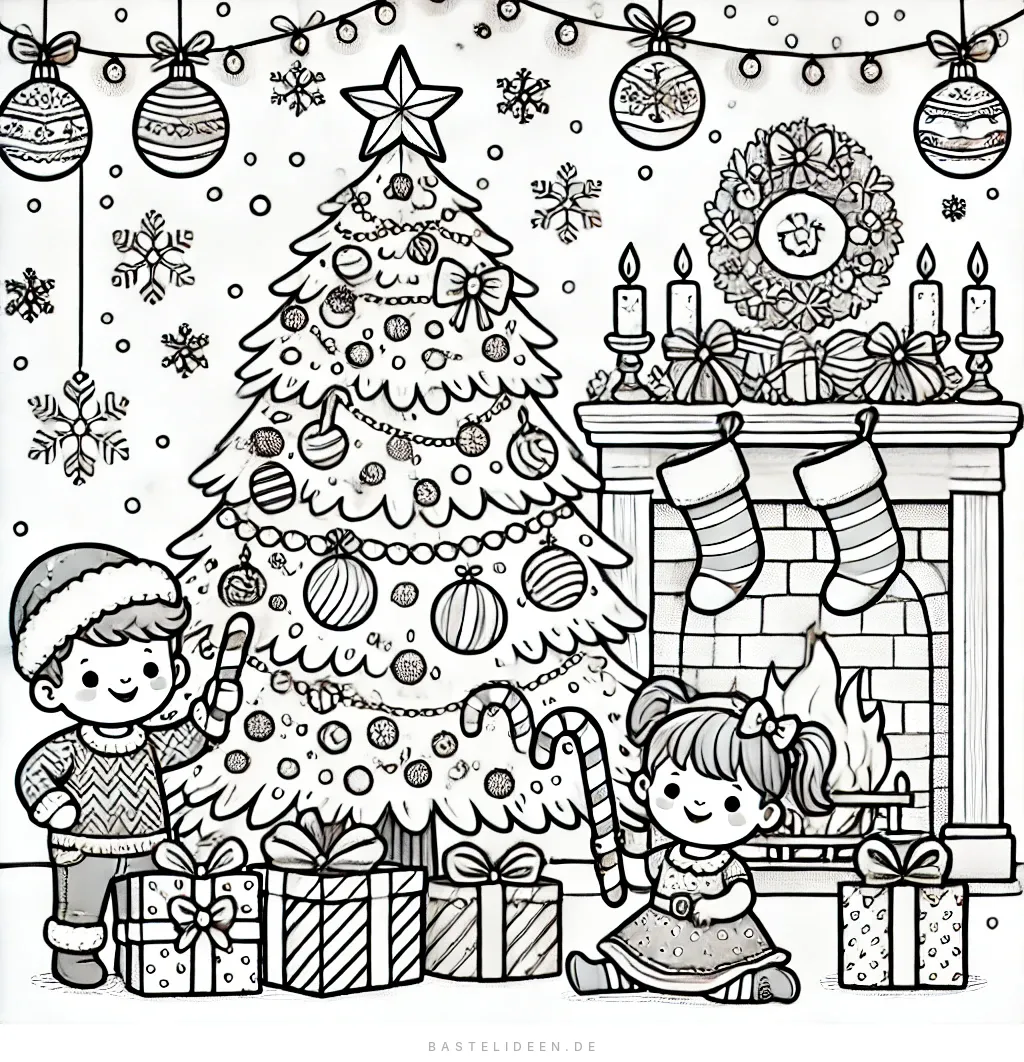 Dieses fröhliche Ausmalbild fängt die Magie des Heiligabends ein, mit zwei Kindern, die fröhlich Zuckerstangen halten, neben einem festlich geschmückten Weihnachtsbaum.