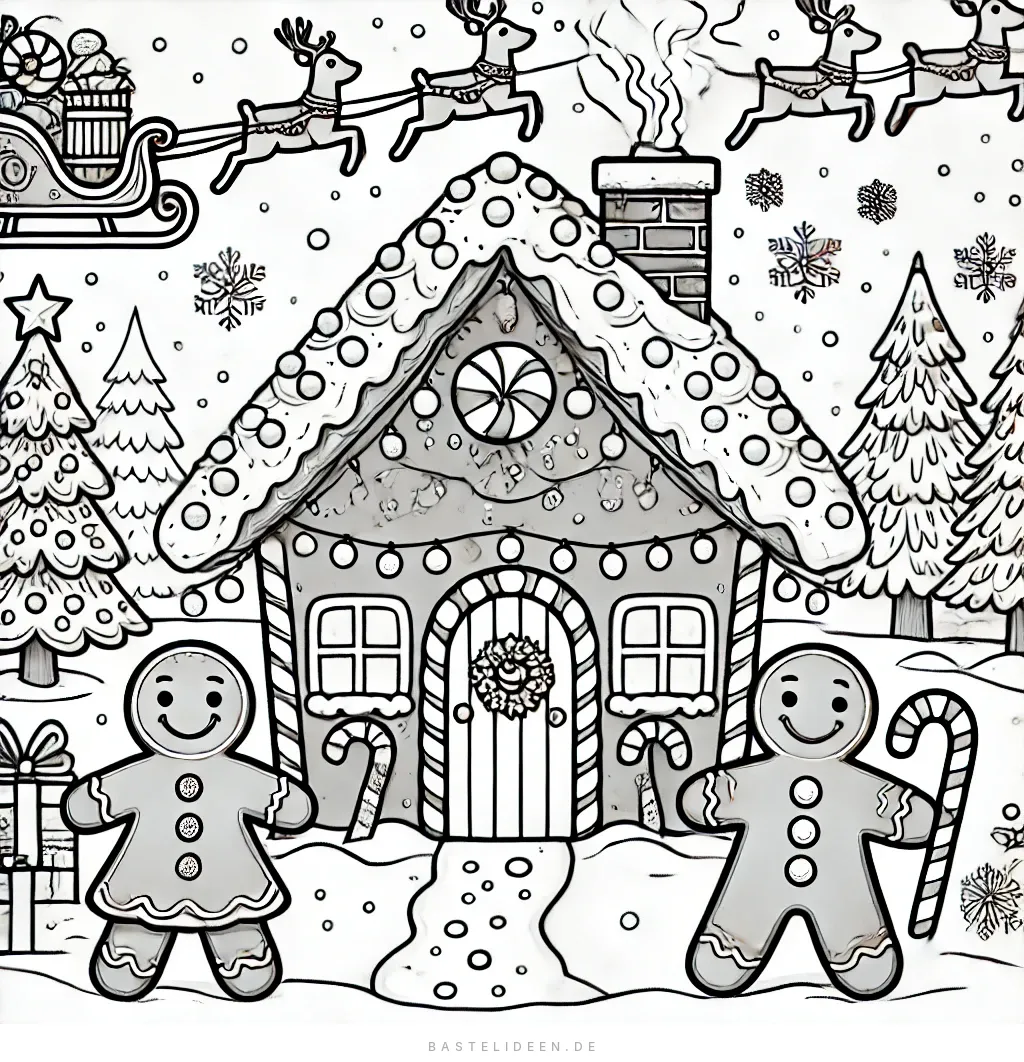 Tauche ein in eine märchenhafte Weihnachtswelt mit diesem zauberhaften Ausmalbild! Das gemütliche Lebkuchenhaus ist von Zuckerstangen, Weihnachtsbäumen und zwei fröhlichen Lebkuchenfiguren umgeben.