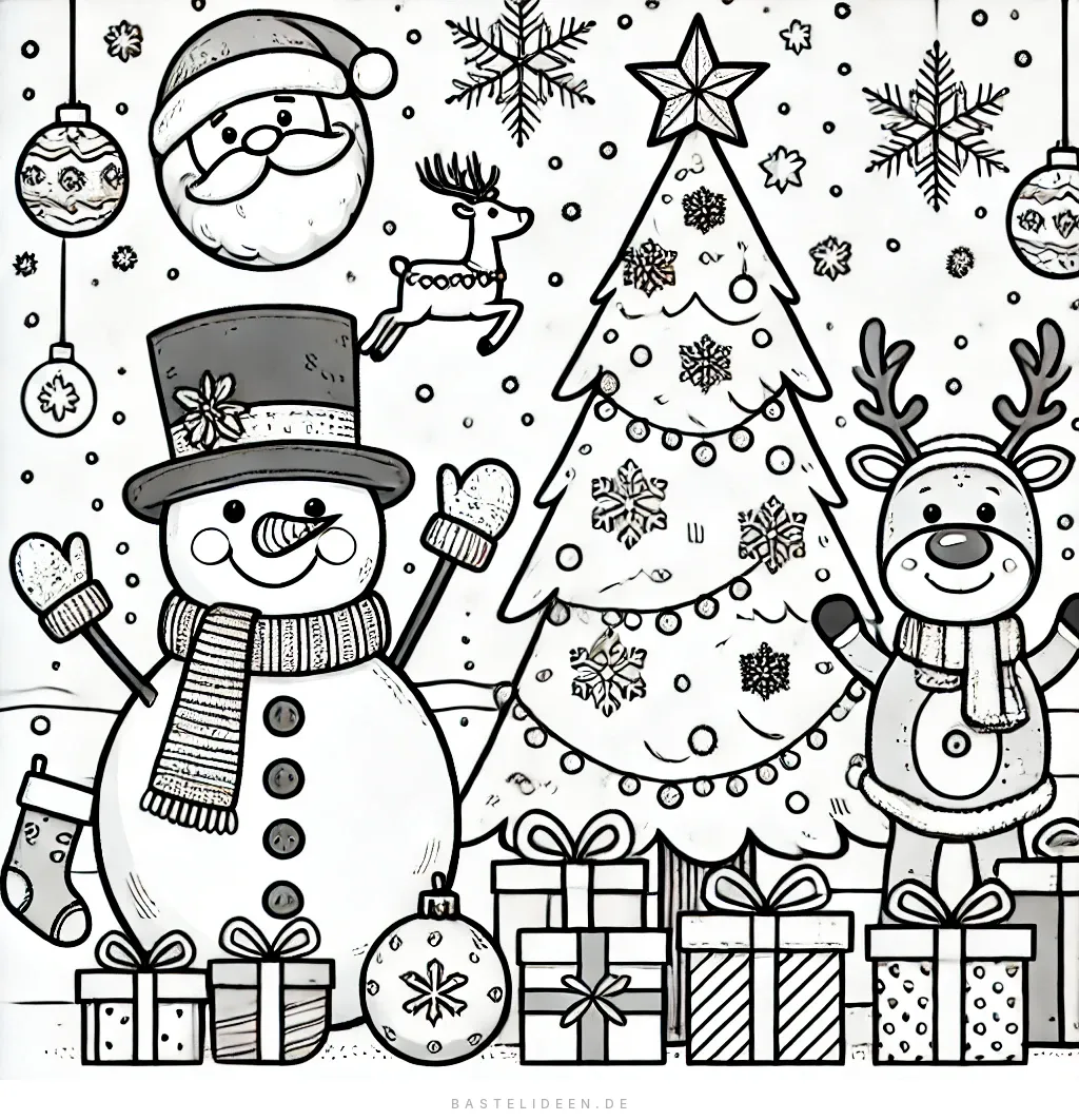 Tauche ein in die Weihnachtsstimmung mit diesem fröhlichen Ausmalbild! Ein lächelnder Schneemann und ein freundliches Rentier begrüßen dich, während hübsch verpackte Geschenke unter einem geschmückten Weihnachtsbaum darauf warten, von dir ausgemalt zu werden.