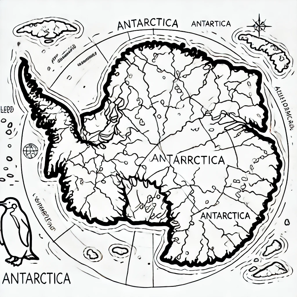 Dieses detaillierte Ausmalbild zeigt eine Karte der Antarktis, die ihre einzigartige Form und verschiedene Regionen hervorhebt. Das Bild enthält bemerkenswerte Wahrzeichen wie die umliegenden Inseln und einen niedlichen Pinguin, der der lehrreichen Illustration einen Hauch von Charme verleiht.