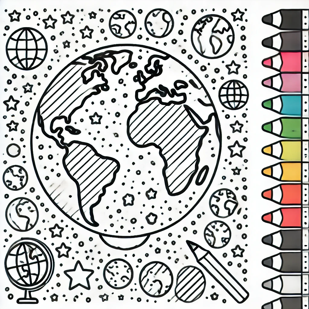 Dieses faszinierende Ausmalbild zeigt eine wunderschön gezeichnete Darstellung der Erde, umgeben von Sternen und verschiedenen kleineren Globen. Der zentrale Globus hebt die Kontinente mit klaren Linien hervor und lädt zu kreativer Farbgestaltung ein.
