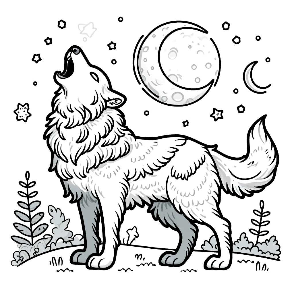 Ein majestätischer Wolf heult den Mond an, umgeben von einem sternenklaren Nachthimmel.