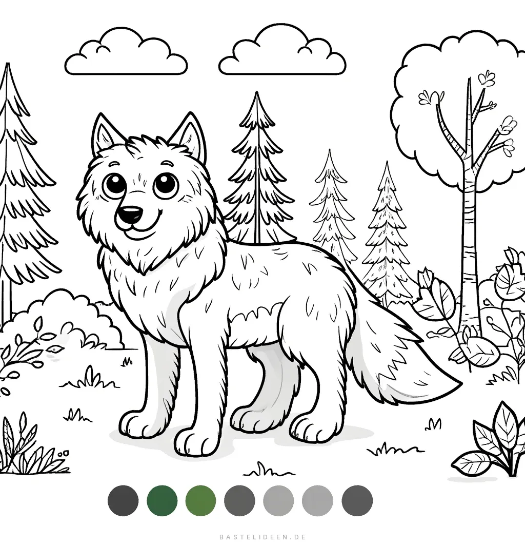 Ein niedlicher, freundlicher Wolf steht in einem Wald mit Tannen, Büschen und Wolken am Himmel.