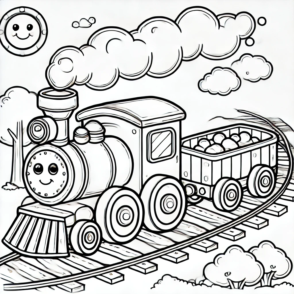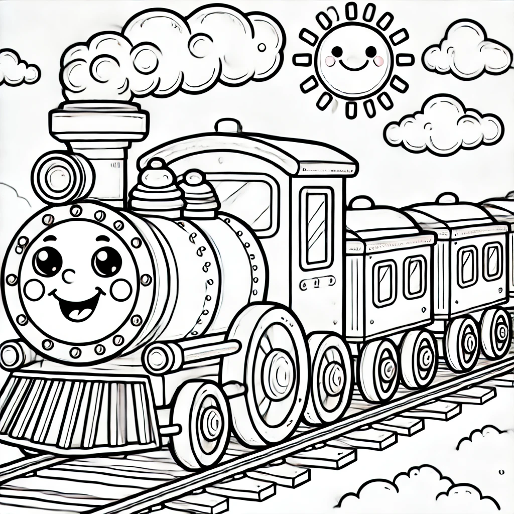 Diese entzückende Malvorlage zeigt eine fröhliche Dampflok mit einem freundlichen, lächelnden Gesicht, die auf den Gleisen entlangfährt. Der Zug ist von flauschigen Wolken und einer lächelnden Sonne umgeben.