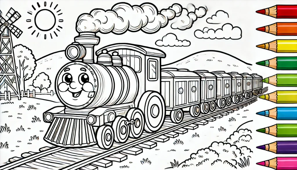 Dieses bezaubernde Ausmalbild zeigt einen fröhlichen Zug mit einem lächelnden Gesicht, der durch eine malerische Landschaft tuckert. Im Hintergrund findest Du sanfte Hügel, fluffige Wolken und eine strahlende Sonne, zusammen mit einem klassischen Windrad und Bäumen.