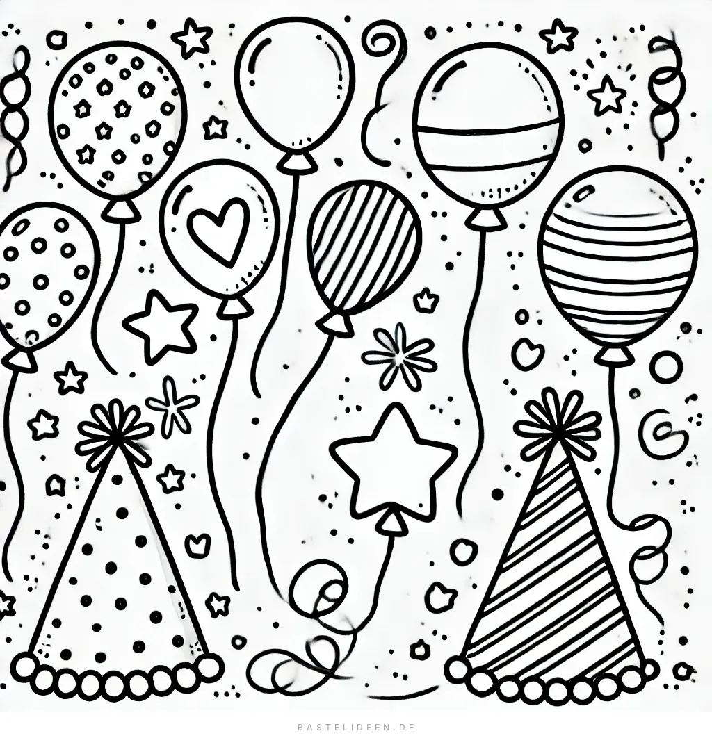 Dieses festliche Bild zeigt eine lebendige Sammlung von Luftballons, Sternen, Partyhüten und wirbelnden Dekorationen, die die perfekte Party-Stimmung schaffen. Die verspielten Designs auf den Ballons, von Herzen bis hin zu Streifen, und die fröhlichen Partyhüte verstärken das feierliche Gefühl.