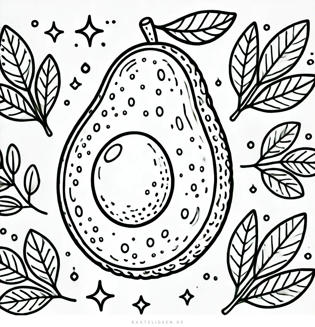 Dieses elegante Avocado-Ausmalbild zeigt eine wunderschön illustrierte Avocado mit einem glatten Kern, umgeben von üppigen Blättern und feinen Sternen.