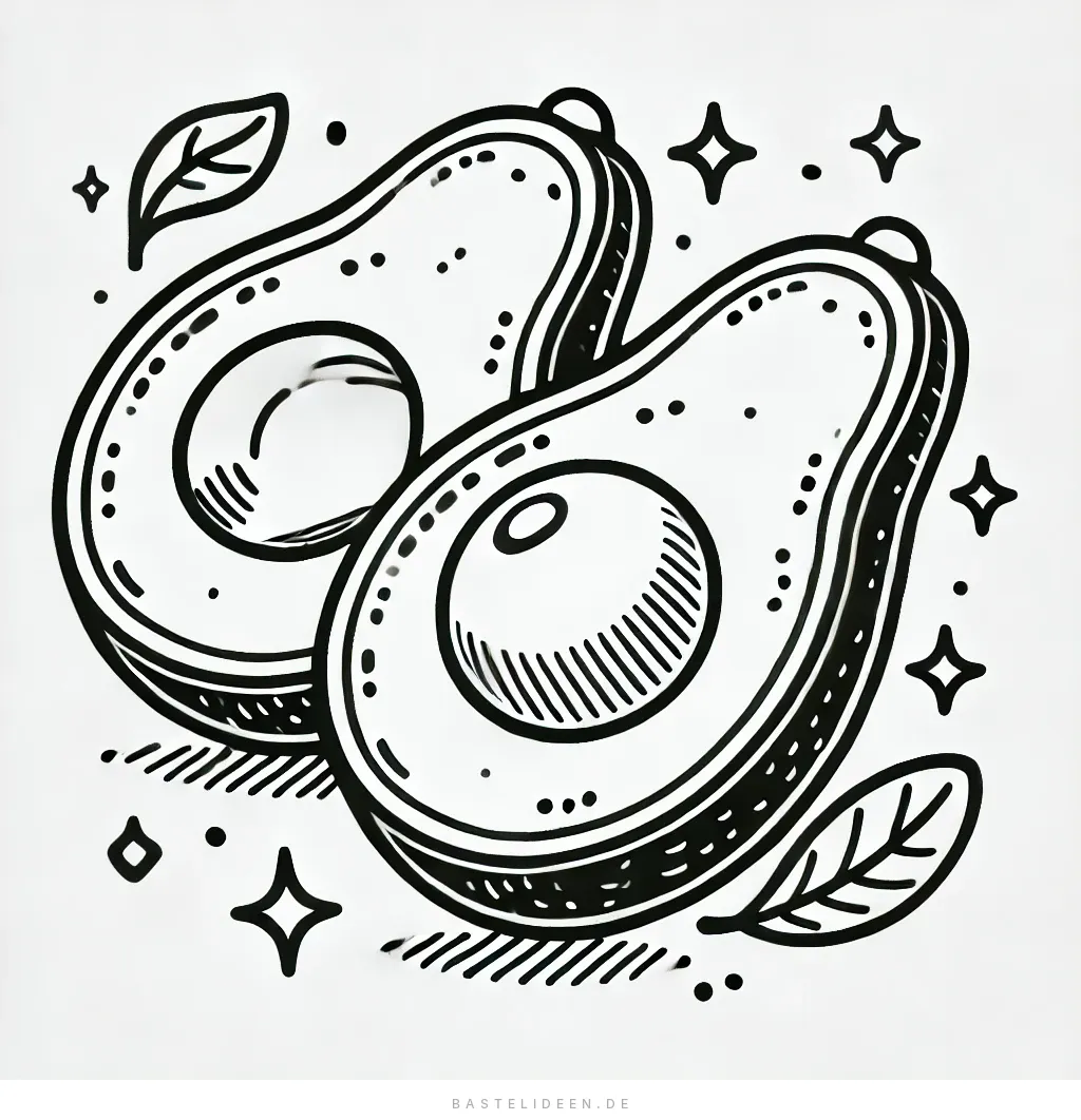 Dieses bezaubernde Ausmalbild zeigt zwei wunderschön illustrierte Avocado-Hälften, jede mit ihrem Kern und glatten Texturen. Umgeben von kleinen Blättern und funkelnden Sternen.
