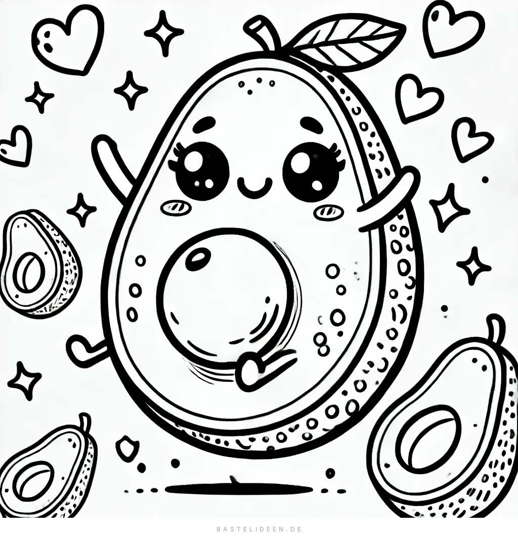 Dieses niedliche Avocado-Ausmalbild sprüht vor Charme! Die fröhliche Avocado hat ein breites Lächeln, große Kulleraugen und ist von verspielten Elementen wie Herzen und Sternen umgeben.