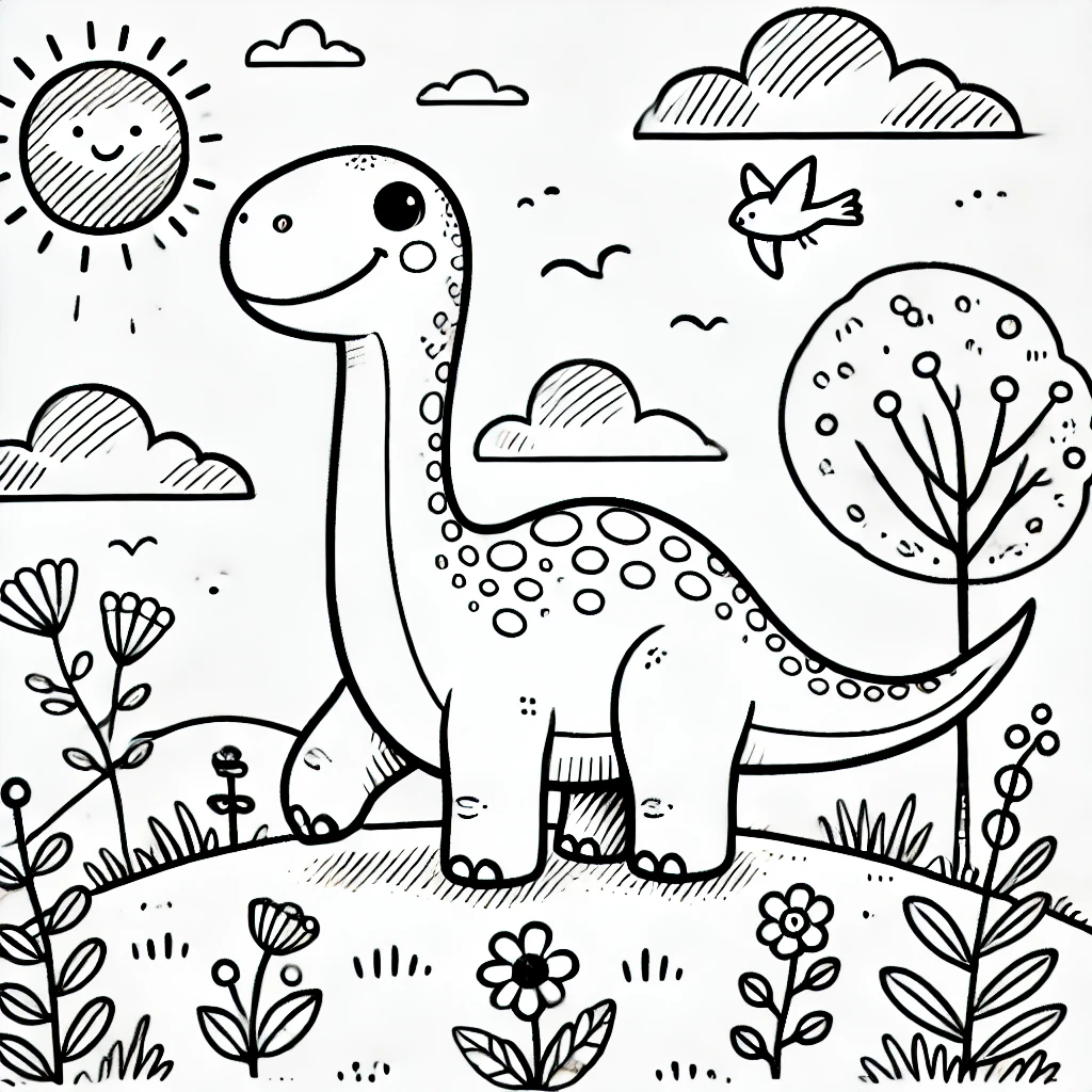 Dieses niedliche Ausmalbild zeigt einen lächelnden Brachiosaurus, der durch eine fröhliche, mit Blumen gefuellte Landschaft unter einer lächelnden Sonne spaziert, begleitet von einem spielerischen Vogel.